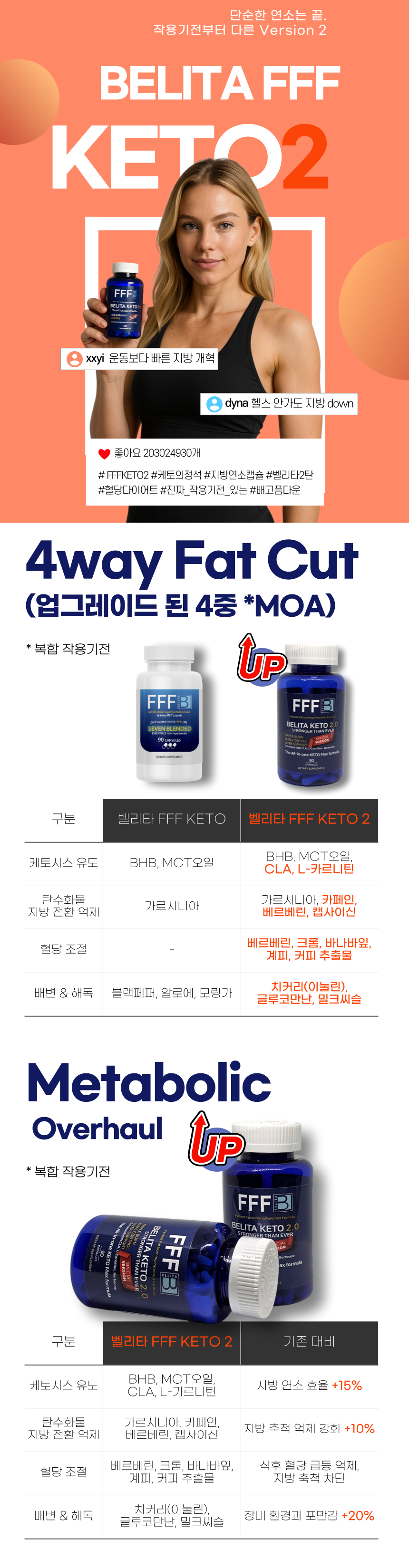 KETO 버전1의 7가지 핵심 성분을 강화하고,체지방 연소부터 혈당 조절까지 작용기전이 한층 더 정밀해졌습니다.